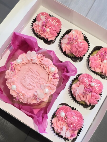 Mini cake (4 inch, 2 layers) with matching 8 cupcakes.